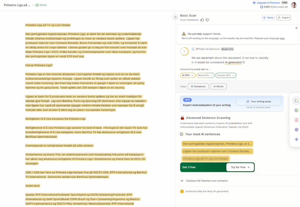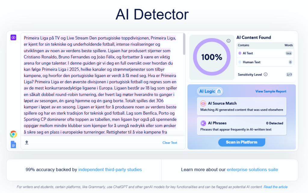 Minus: Som med alle detektorer kan enkelte «menneskelige» tekster fortsatt flagges, og omvendt. Bruk den som et hjelpemiddel, ikke som en domstol.