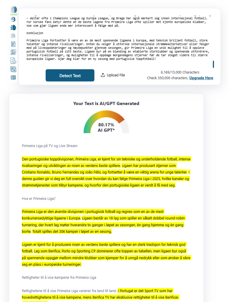 Hvorfor den scorer høyt: Du får en balansert vurdering uten at resultatet presenteres som vitenskapelig ufeilbarlig. For mange vil det være nok å lime inn et avsnitt eller en oppgave og se om teksten bør diskuteres videre. Hvis du leter etter en gratis ai detektor som faktisk er ment for det norske markedet, er gratis ai detektor et naturlig førstevalg – både for elever, foreldre og små bedrifter som ikke vil binde seg til dyre abonnement med én gang.